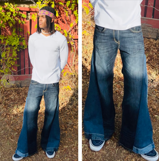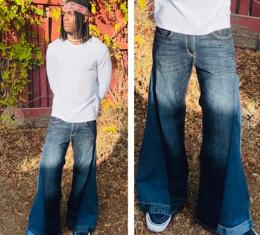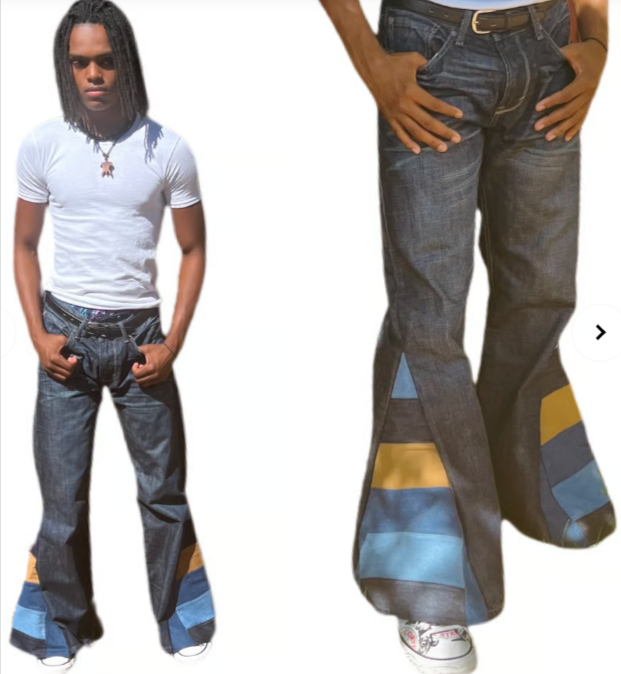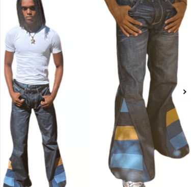 Unique patchwork denim with retro-inspired flare, perfect for adding creative flair and timeless style to any outfit. Limited availability.