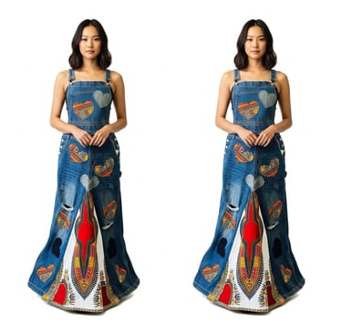 Unique patchwork denim with retro-inspired denim dress, perfect for adding creative flair and timeless style to any outfit. Limited availability.